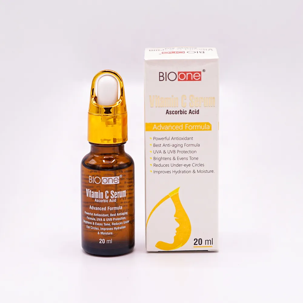 Bio One Vitamin C Serum is a light-textured hydrating serum containing Ethyl Ascorbic Acid, a stable form of Vitamin C, and Pure Hyaluronic Acid. It aims to brighten skin, even skin tone, fade dark spots, reduce wrinkles, improve hydration, and boost collagen production by protecting against free radicals and plumping the skin with moisture. The serum is applied twice daily to clean, slightly damp skin for best results.