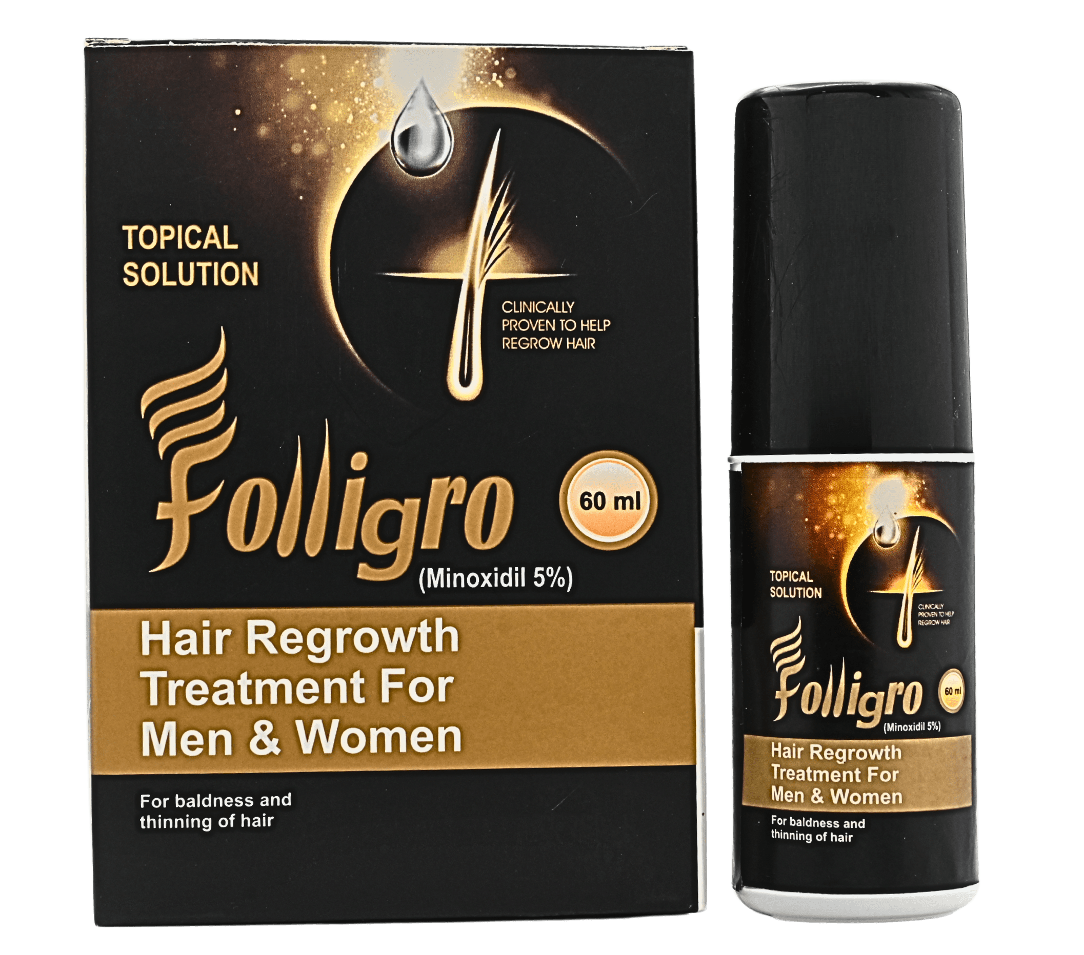 Folligro spray is a topical solution containing 5% Minoxidil used to treat hair loss (androgenetic alopecia) in men and women by stimulating hair regrowth. It works by revitalizing hair follicles and increasing blood flow to the scalp, which helps reactivate the natural hair growth cycle. The spray is applied directly to the scalp, typically twice daily, and is designed to be a lightweight, fast-absorbing treatment.