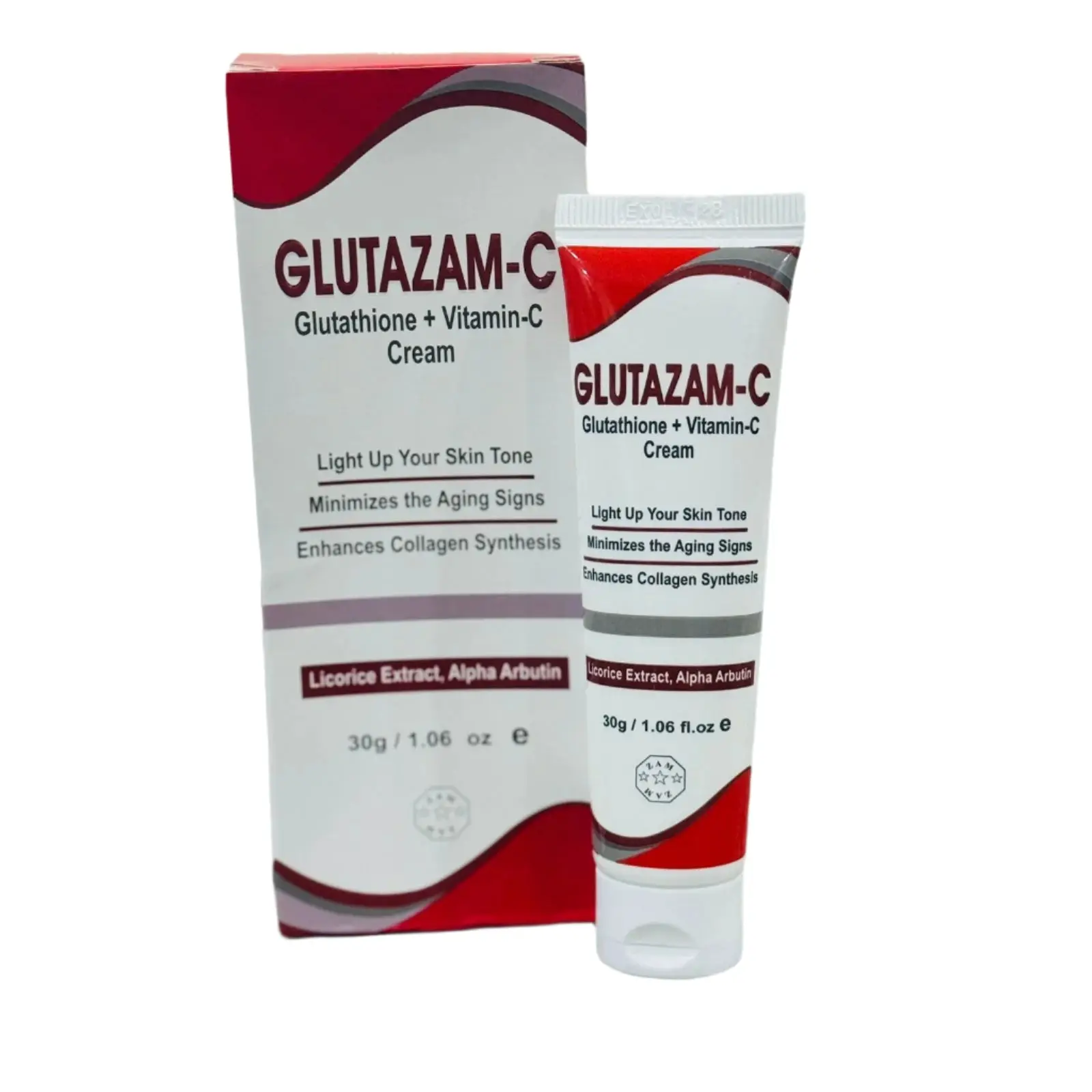 Glutazam-C Cream is a topical skin care product formulated with active ingredients like Glutathione and Vitamin C to brighten skin, reduce hyperpigmentation, and provide antioxidant benefits. The cream aims to inhibit melanin production, leading to a more even skin tone and reduced dark spots, and also helps protect the skin from free radical damage and premature aging.