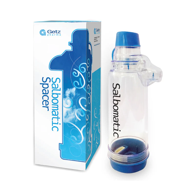 A SALBOMATIC spacer is a medical device used with a metered-dose inhaler (MDI) to make it easier and more effective to deliver asthma or COPD medication to the lungs. It holds the medication in a chamber, allowing the user to inhale it slowly and completely over several breaths, which helps reduce side effects and improve the amount of medicine that reaches the airways.
