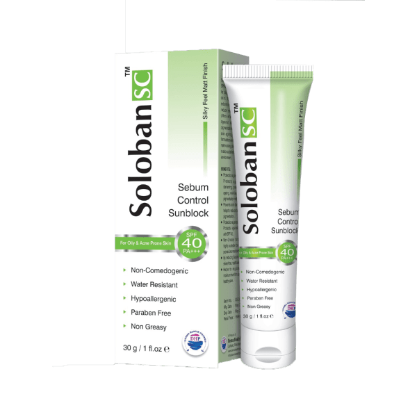 Soloban SC is a sunscreen gel providing SPF 40 and broad-spectrum protection against UVA/UVB rays, formulated to control oil and prevent premature aging. Its sebum-control formula and non-greasy texture make it suitable for oily, combination, and acne-prone skin. Key features include its water-resistant nature, protection against skin darkening and pigmentation, and a light, non-comedogenic formula.